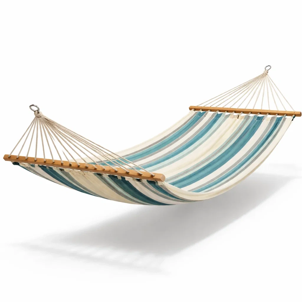 Diese Hängematte verfügt über eine Tragfläche aus Baumwolle und stabile Holzstangen.